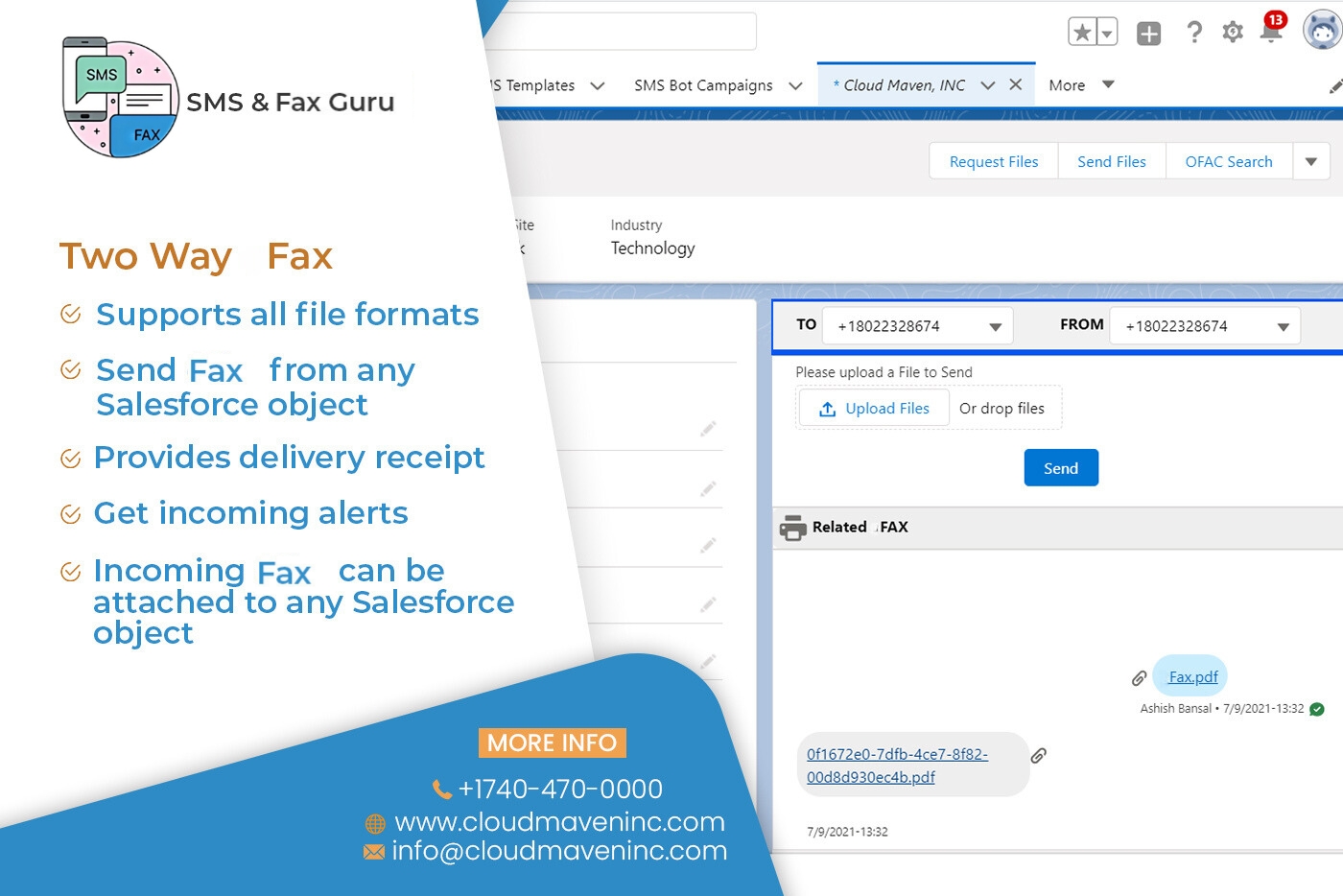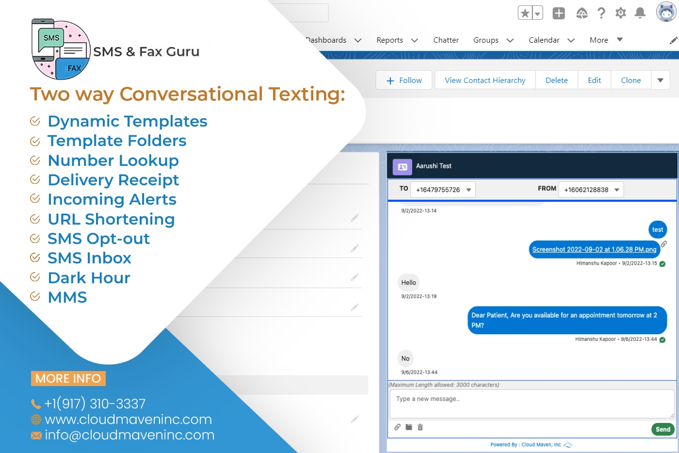 TelephonyEasily send, receive, and automate SMS, MMS, and HIPAA-compliant fax communications within Salesforce. With 10DLC compliance and robust automation features, you can manage customer engagement securely and efficiently.