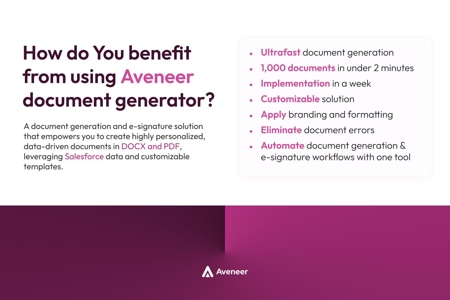 Document GenerationUltra-fast document generation. Automate mass document generation tasks. 1,000 docs with a single click. PDF, Word, XLSX, PNG formats for quotes, orders, contracts, invoices, and reports. Automate workflows, e-sign, storage, and document management.