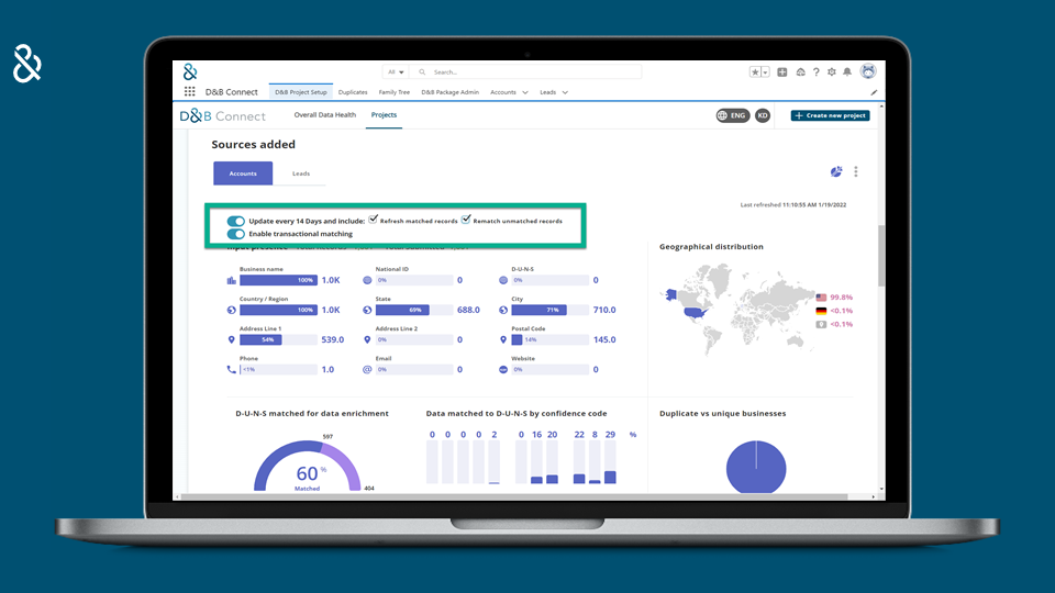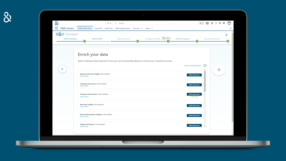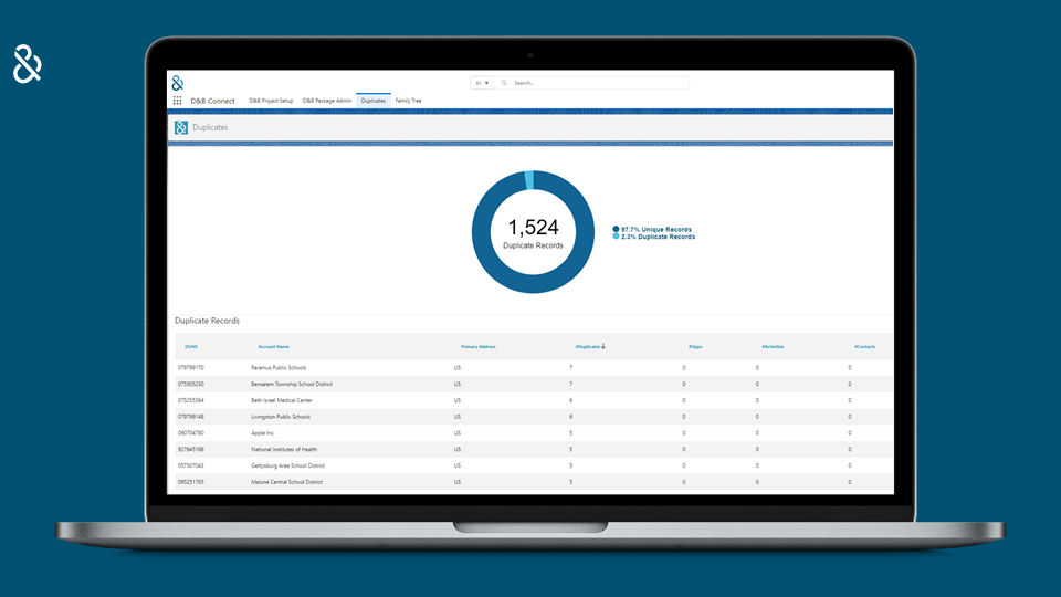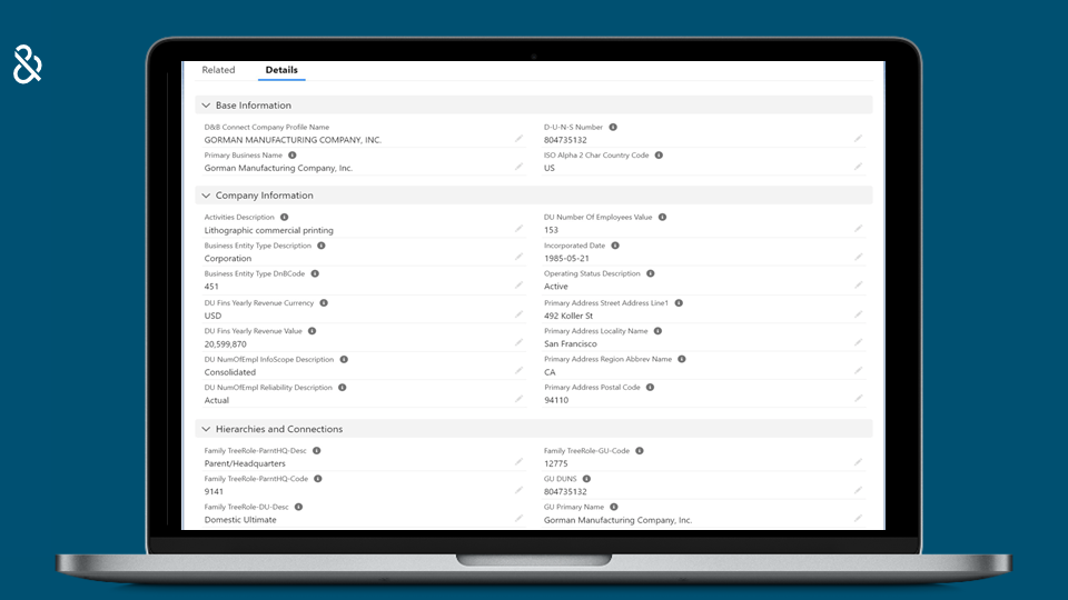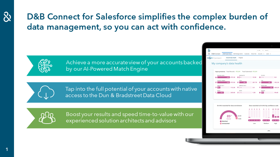 Get an accurate view of accounts and leads to accelerate sales using high-quality, reliable data from the Dun & Bradstreet Data Cloud. Clean, consolidate, and enrich account and contact data natively from your Salesforce CRM.