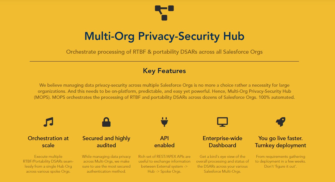 IT ManagementManaging data privacy-security across multiple Salesforce Orgs needs to be on-platform, predictable, and easy yet powerful. Multi-Org Privacy-Security Hub orchestrates the processing of RTBF and portability DSARs across dozens of Salesforce Orgs.