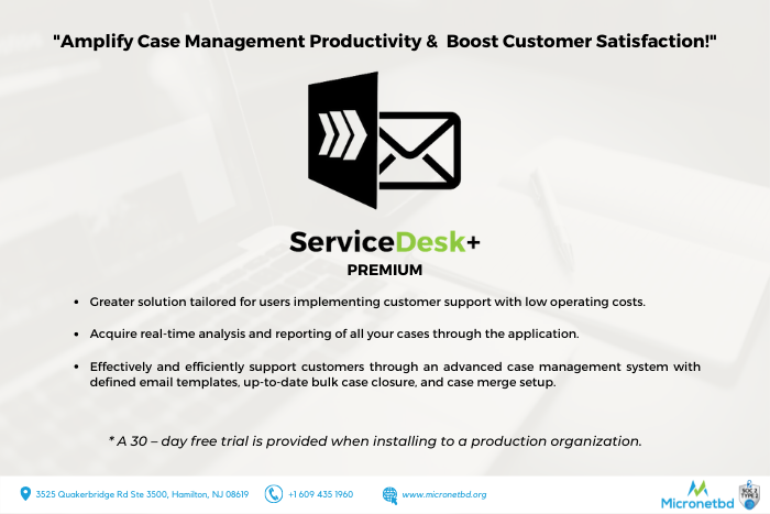 ProductivityUpgrade your basic Email-to-Case program with a greater solution called ServiceDesk+. It is an advanced case management system with custom email templates, up-to-date bulk case closure, and case merge setup. Stay on top of the game with ServiceDesk+!