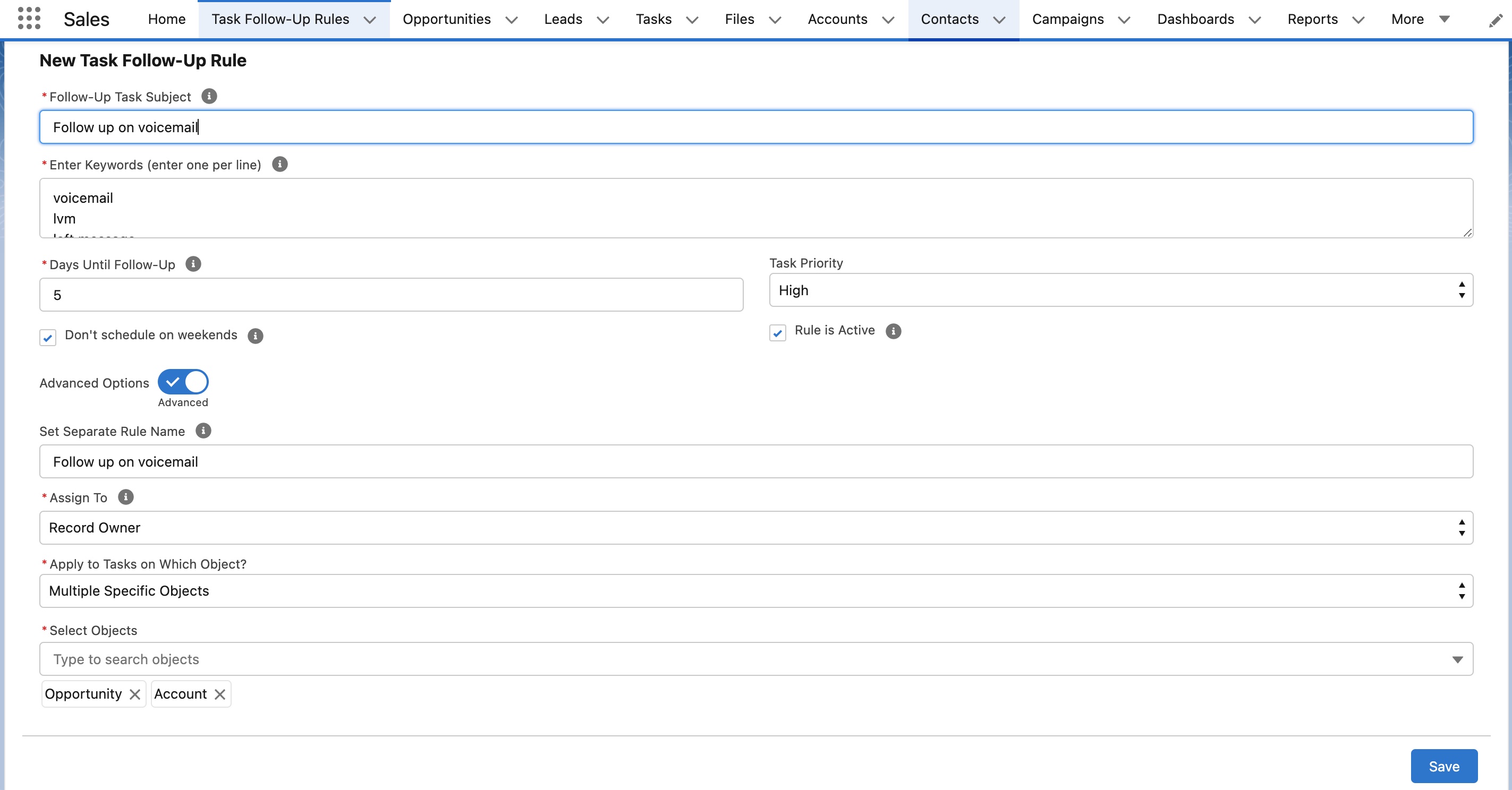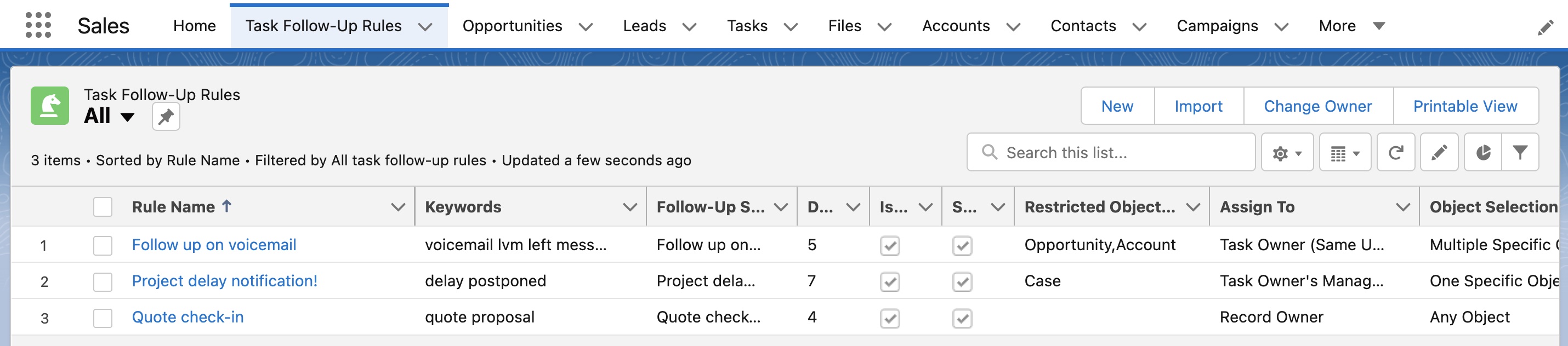 Task Follow-Up Rules allows business users to build out their own automated processes without requiring the skills or system privileges of an admin. Manage business logic with a simple custom object!