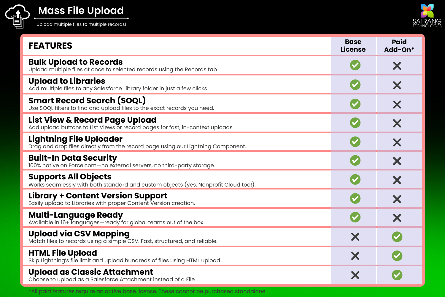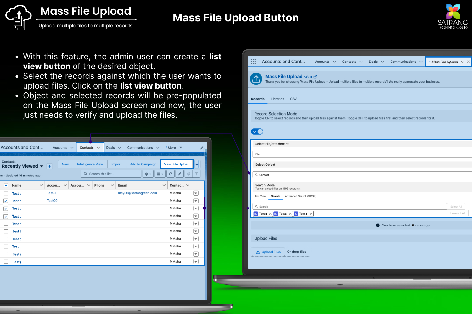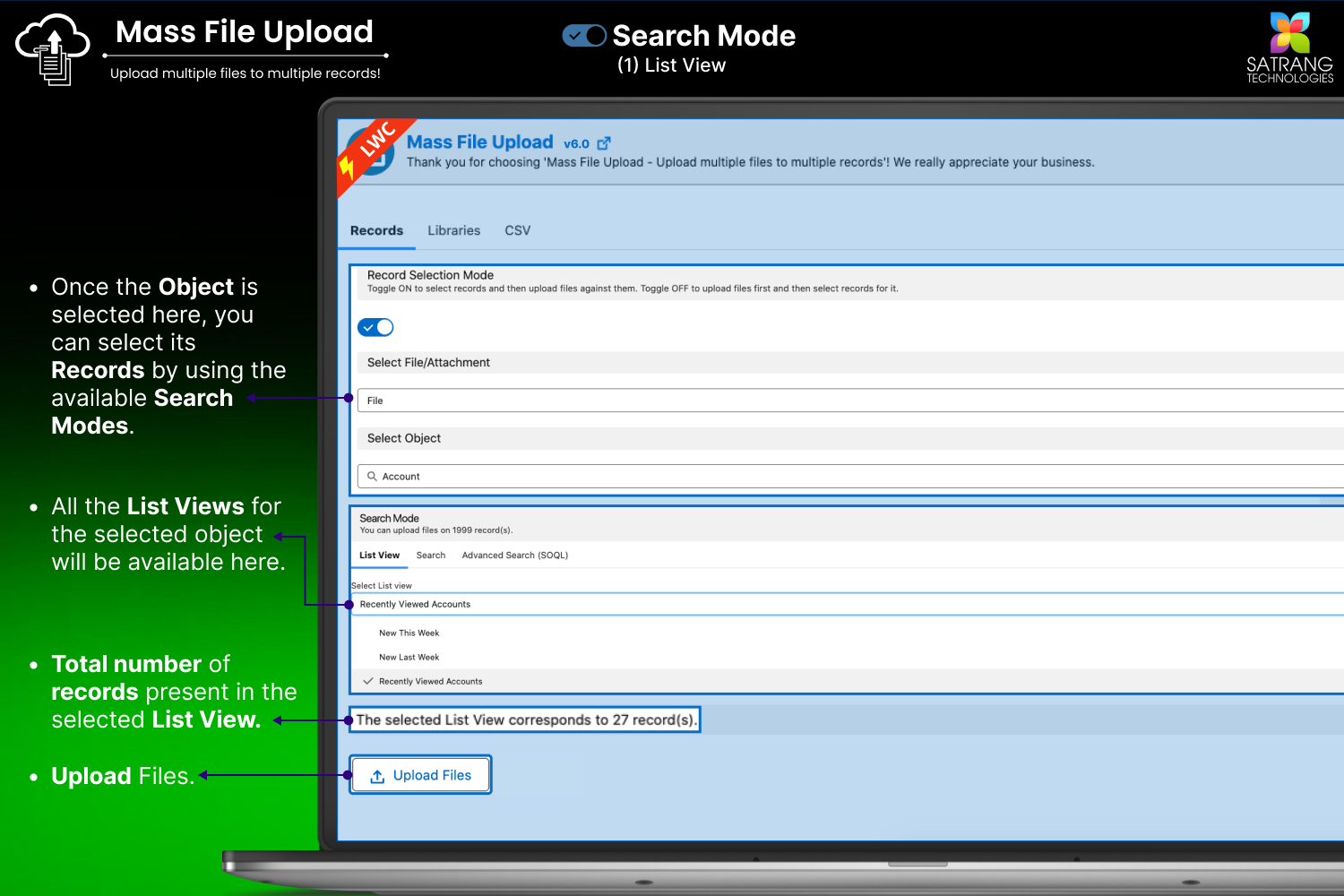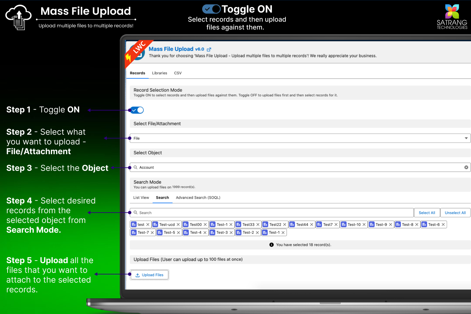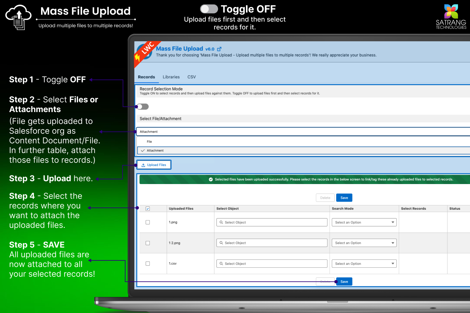 Mass upload Salesforce files & attachments to multiple records or libraries####Upload files via List View, Search, or Advanced SOQL####Supports standard & custom objects####Secure, native Salesforce transfers, fast, bulk, & compliant####Free trial available