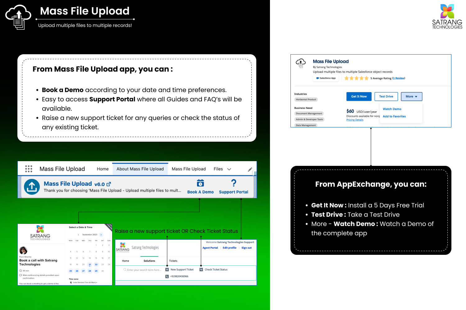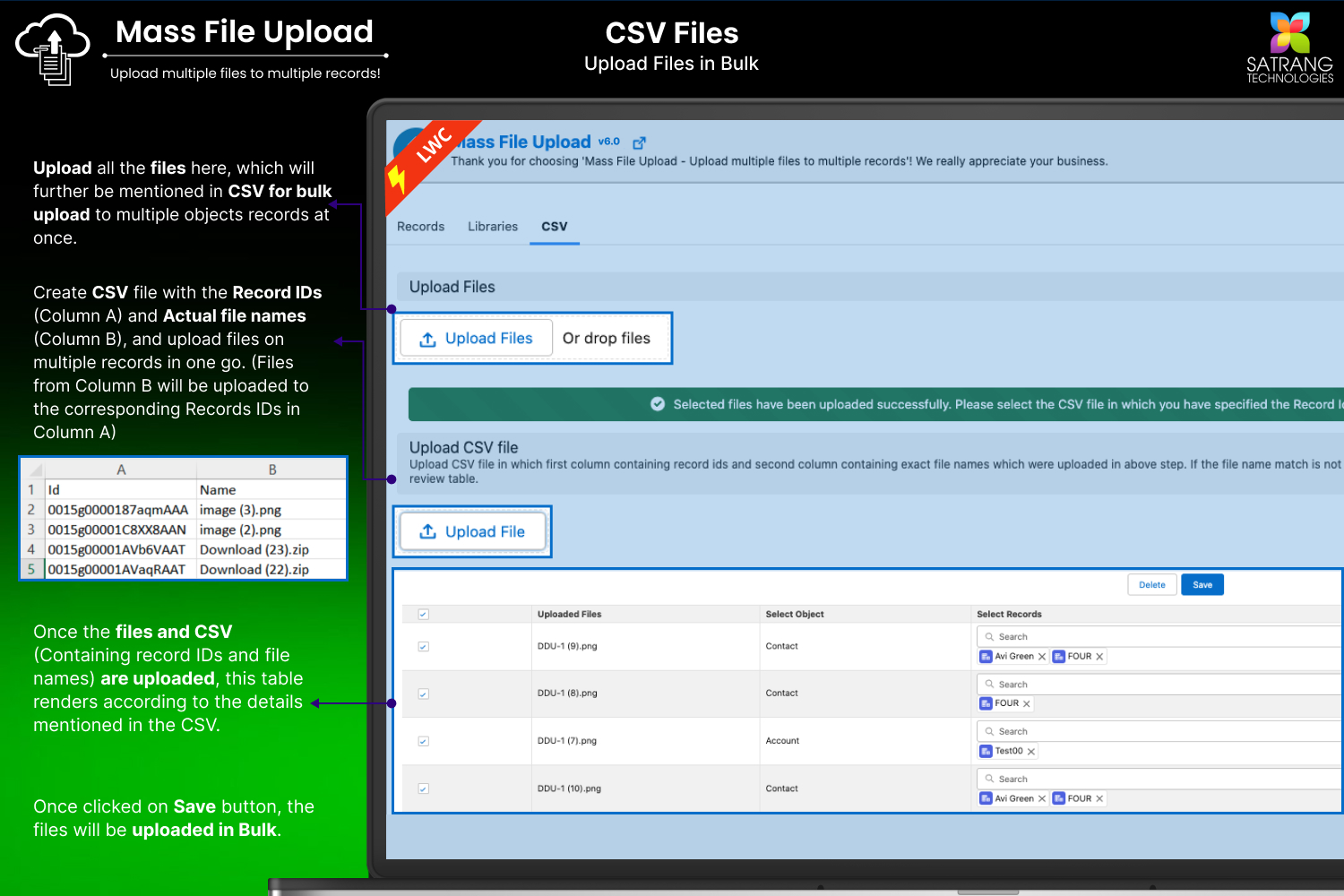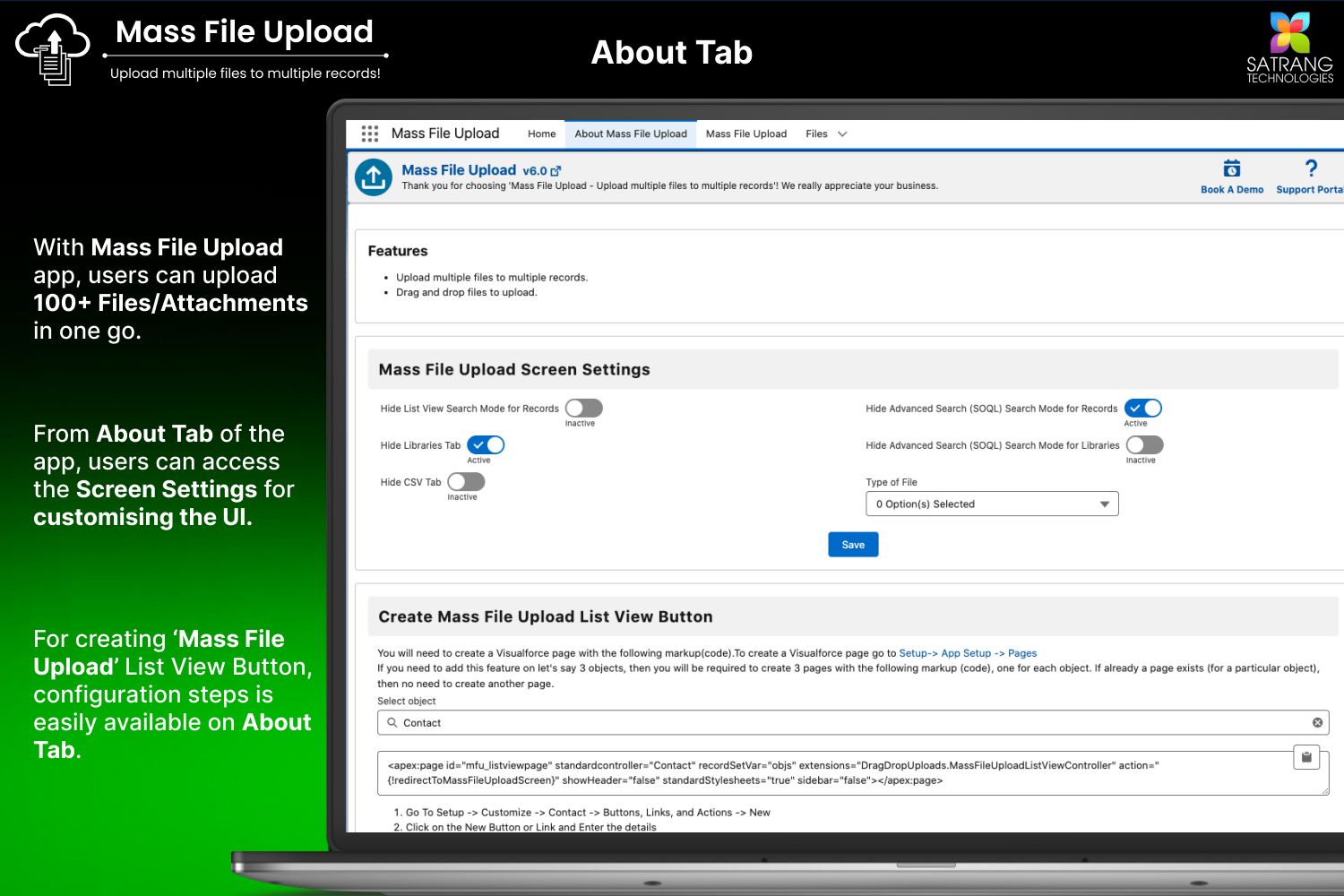 A. Introduction####This document lays out the terms and conditions by which ‘Satrang Technologies Private Limited’ (“Satrang Technologies”) agrees to provide you with our solution offering named - “Mass File Upload.” By registering for and using our application, you agree to the terms and conditions mentioned in this Agreement. If you enter into this agreement on behalf of your organization or other entity, you represent that you have the authority to legally bind such entity to these terms and conditions, in which case the terms "you" or "your" shall refer to such entity. If you do not have such authority, or if you do not agree with these terms and conditions, you may not use the solution.####B. Ownership and Licensing####Satrang Technologies Private Limited hereby grants you a non-exclusive, non-transferable, global right to use the solution only for your own internal Organization's use. Satrang Technologies Private Limited has reserved all rights not explicitly granted to you.####You shall not (i) license, sublicense, sell, resell, transfer, assign, distribute, or otherwise commercially exploit or make available to any third party the product in any way (ii) change or make custom works based upon the solution; (iii) create internet links to the solution (iv) reverse engineer or access the solution to build a competitive solution (v) use it to send spam or computer viruses (vi) violate applicable laws and regulations.####Satrang Technologies alone shall own all rights, titles, and interests, including all related Intellectual Property Rights, in and to the use of its technology and any suggestions, ideas, enhancement requests, feedback, or other information provided by you or any other party relating to the solution. This agreement is not a sale and doesn't seem to convey to you any rights of ownership to the Intellectual Property rights owned by Satrang Technologies.####C. Liability Disclaimer####The solution is provided to you on an "as is" basis. Satrang Technologies makes no claim or guarantee as to the reliability, timeliness, quality, suitability, truth, accessibility, correctness, or wholeness of the solution. Satrang Technologies does not claim or warrant that (i) the use of the solution will be secure, without disruption, without errors, or work in combination with any other hardware or software, (ii) the solution will meet your needs, (iii) errors or defects will be corrected (iv) the solution is free of viruses or other damaging components.####Satrang Technologies shall not be held accountable for the damage or failure of using the Mass File Upload.####D. Contact Information####For questions and more information, contact us:####Satrang Technologies Private Limited ##1403-1404, Accord Classic##Goregaon East, Mumbai - 400063##India##+91-9820436966####Last Updated: Fri, 27th February 2026