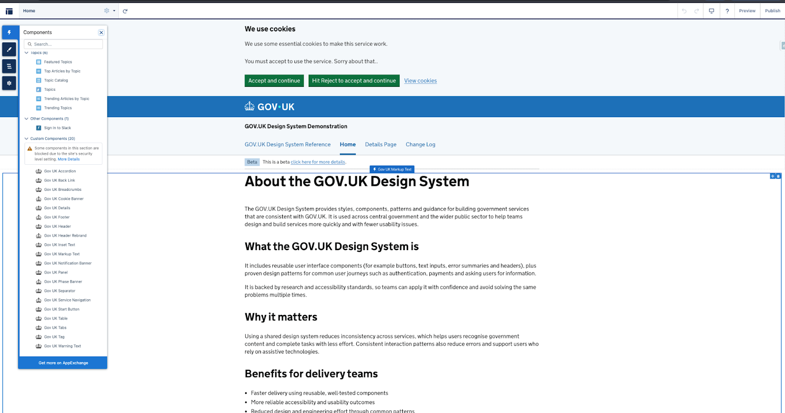 Admin & Developer ToolsCreate public facing government services to align with the GDS GOV.UK Design System standards without coding.