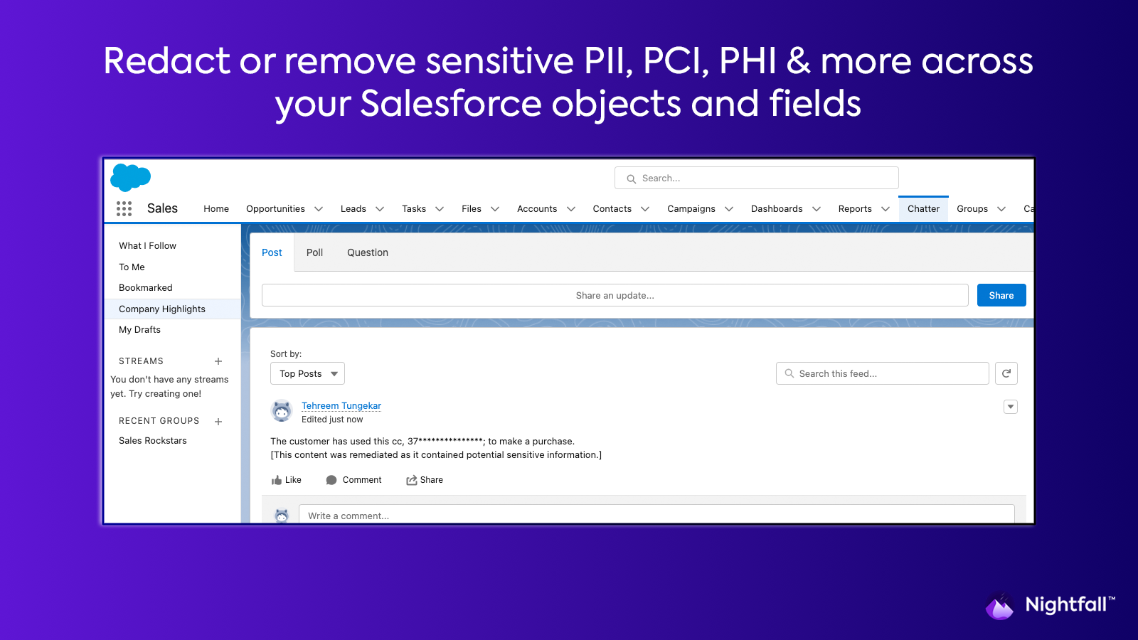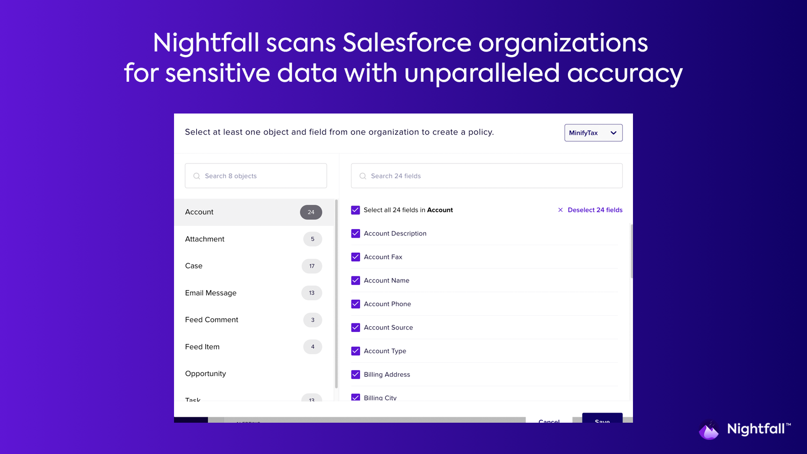 Data CleansingNightfall™ for Salesforce is a data security and compliance platform that helps find and protect your most sensitive data (customer data, PII, PHI, Secrets and Keys, etc.) in Salesforce Cloud, preventing exfiltration to maintain customer trust.