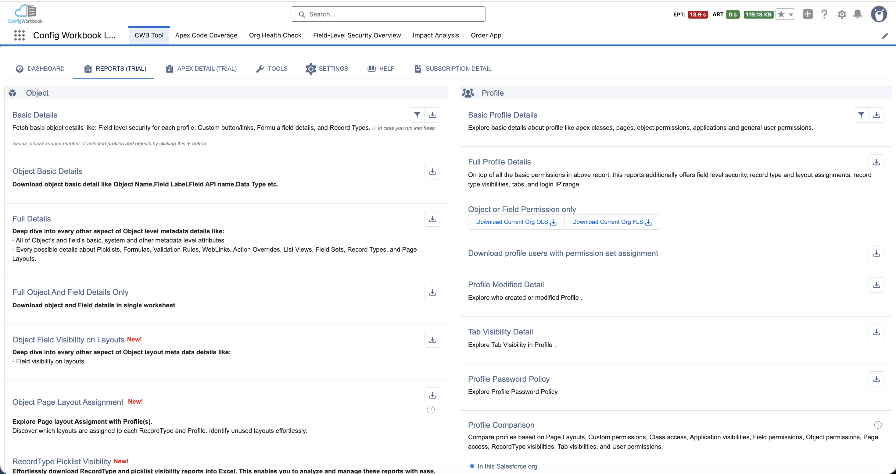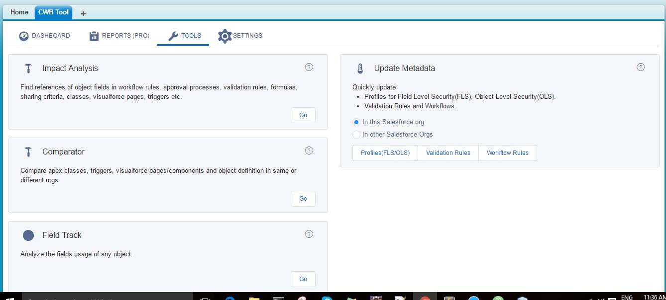 Admin & Developer ToolsExtract Salesforce metadata and store it in Excel files. The tool can extract metadata such as Field Level Security, Profile permissions across objects, fields, Page Layouts etc. Additionally, the tool offers features like Impact Analysis.
