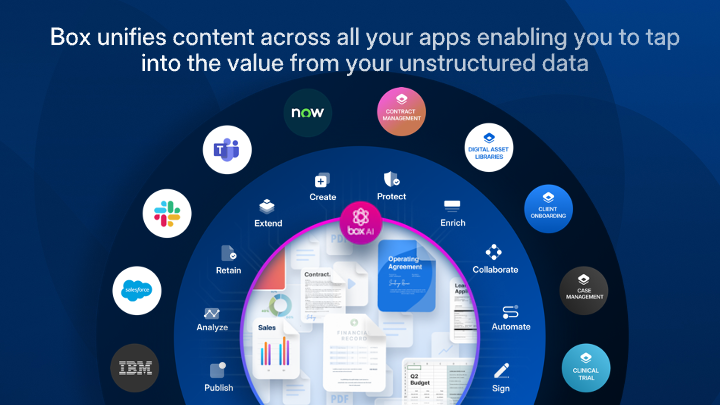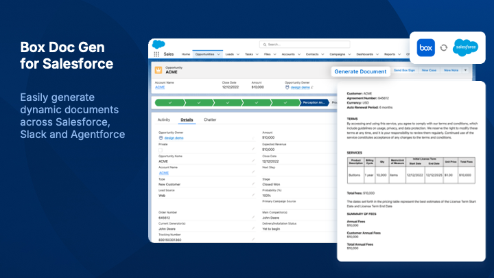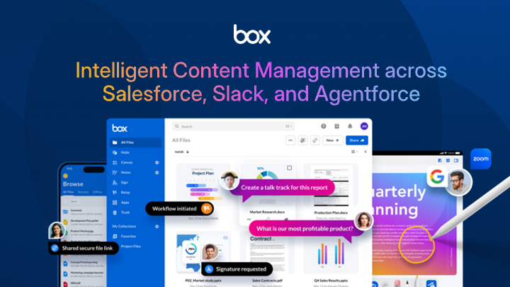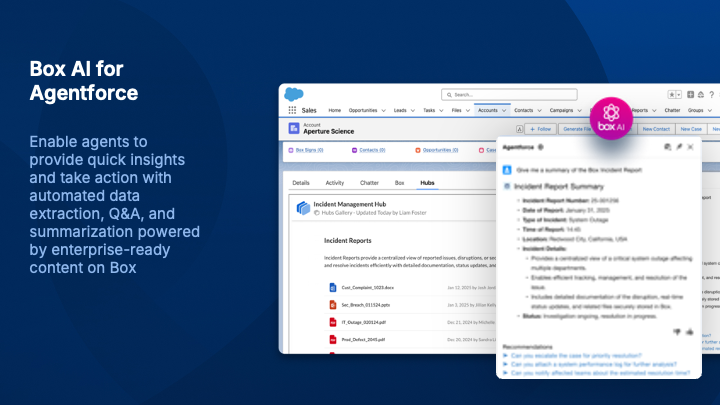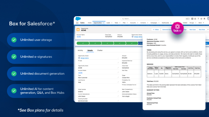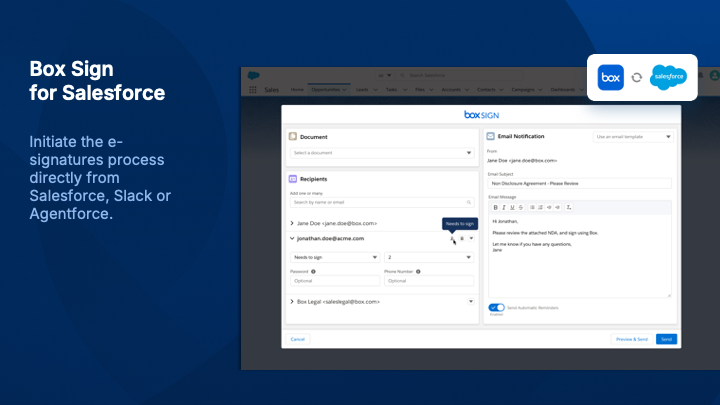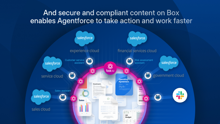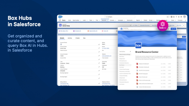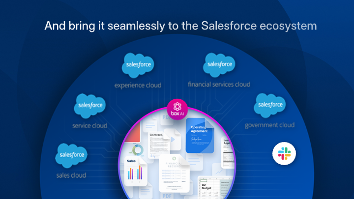 Box helps you securely manage content across your entire business lifecycle. Users can easily generate documents, e-sign, and collaborate across Salesforce, Slack, Agentforce and more — powered by AI-infused insights and automated workflows.
