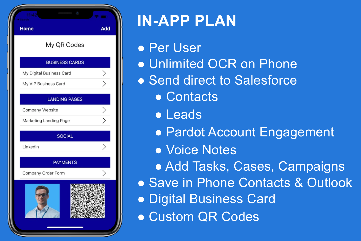 Free Add OCR services to Save Business Cards, NFC Digital Cards, QR Codes, and event badges to Salesforce Contact, Leads, Pardot Account Engagement. Add voice notes, add to Campaigns. Get your own Digital Business Cards and unlimited custom QR Codes. $49.99 USD per user per month Add OCR services to Save Business Cards, NFC Digital Cards, QR Codes, and event badges to Salesforce Contact, Leads, Pardot Account Engagement. Add voice notes, add to Campaigns. Get your own Digital Business Cards and unlimited custom QR Codes.