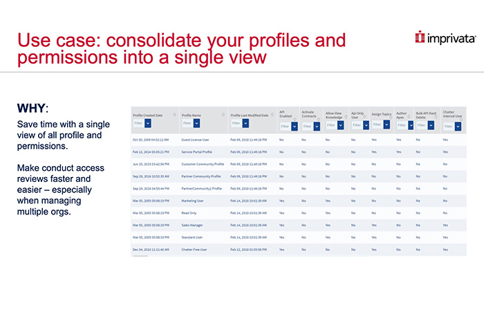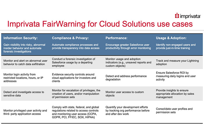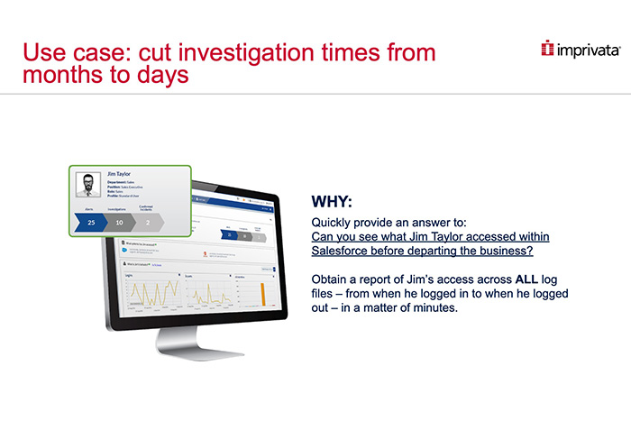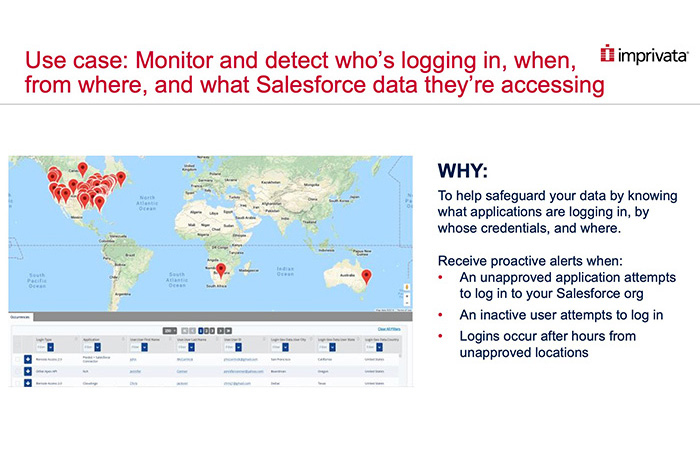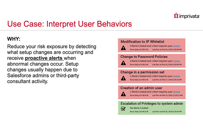 IT & AdministrationImprivata Cloud Solutions Intelligence is purpose-built to translate Shield: Event Monitoring data in real-time to help you mitigate security risks with alerts on any of your Salesforce users acting in any way that could hurt your business.