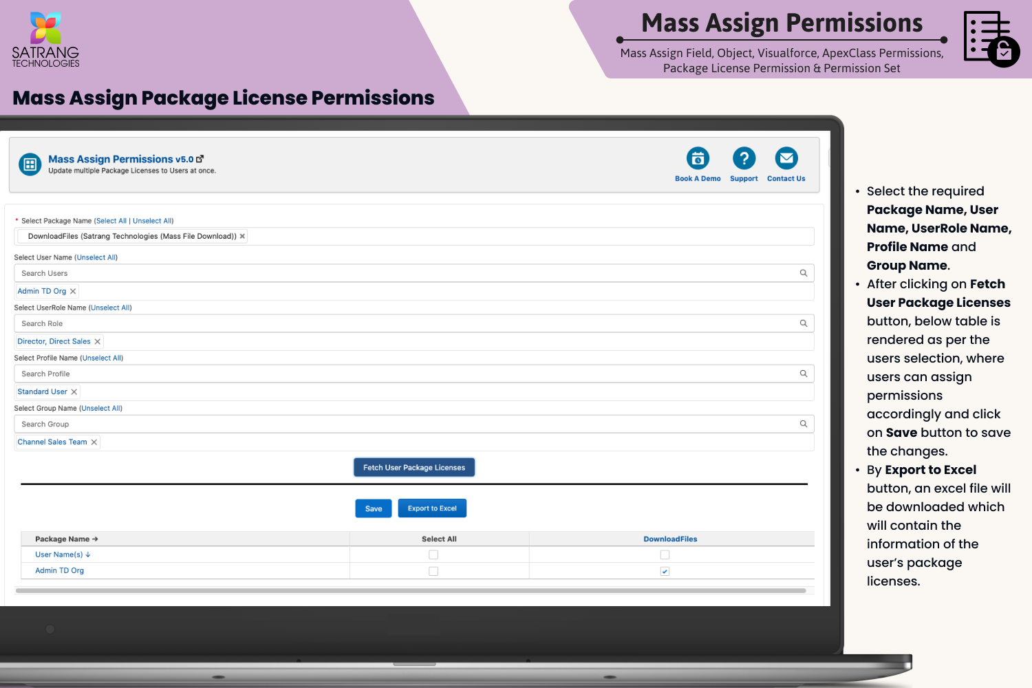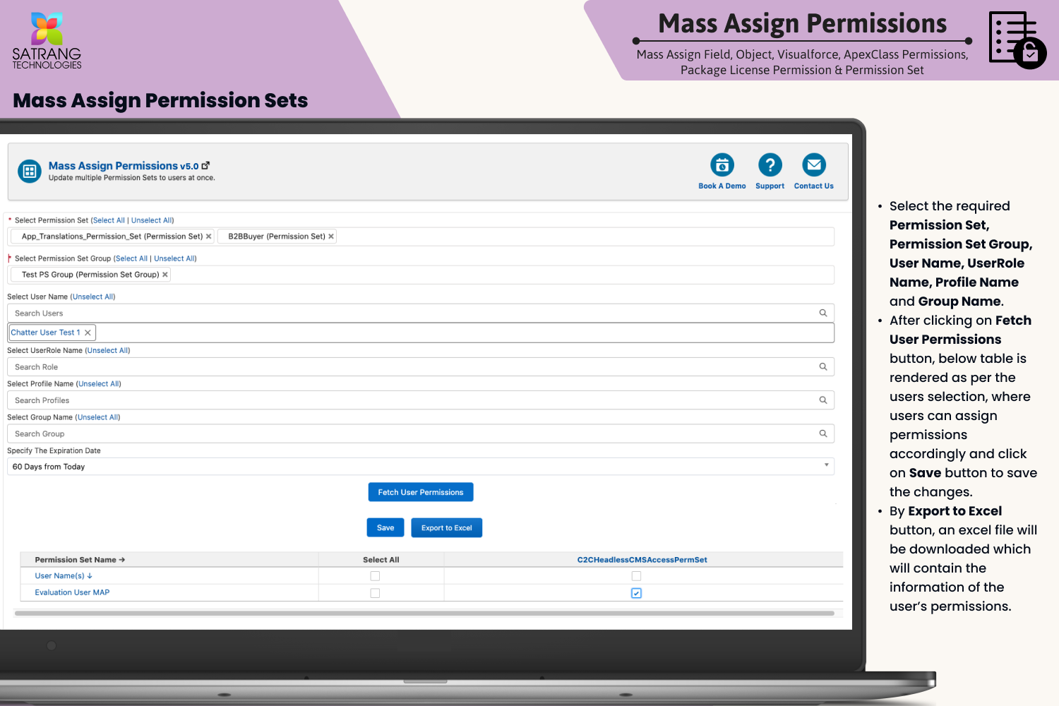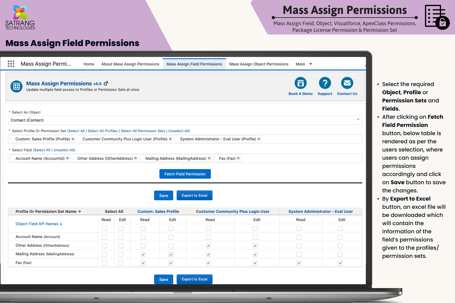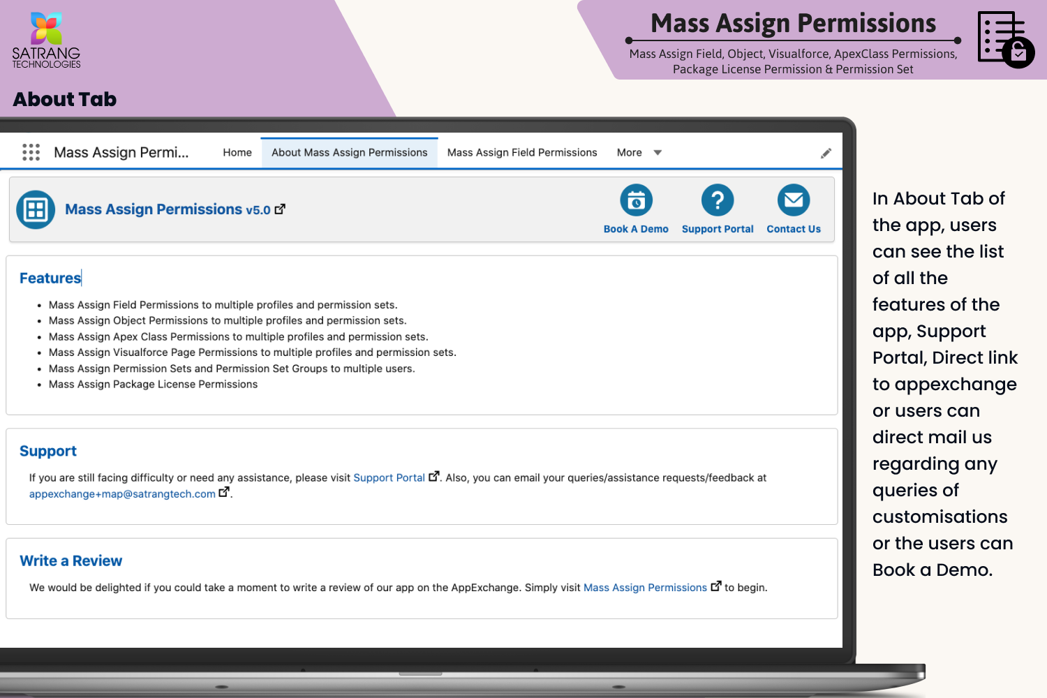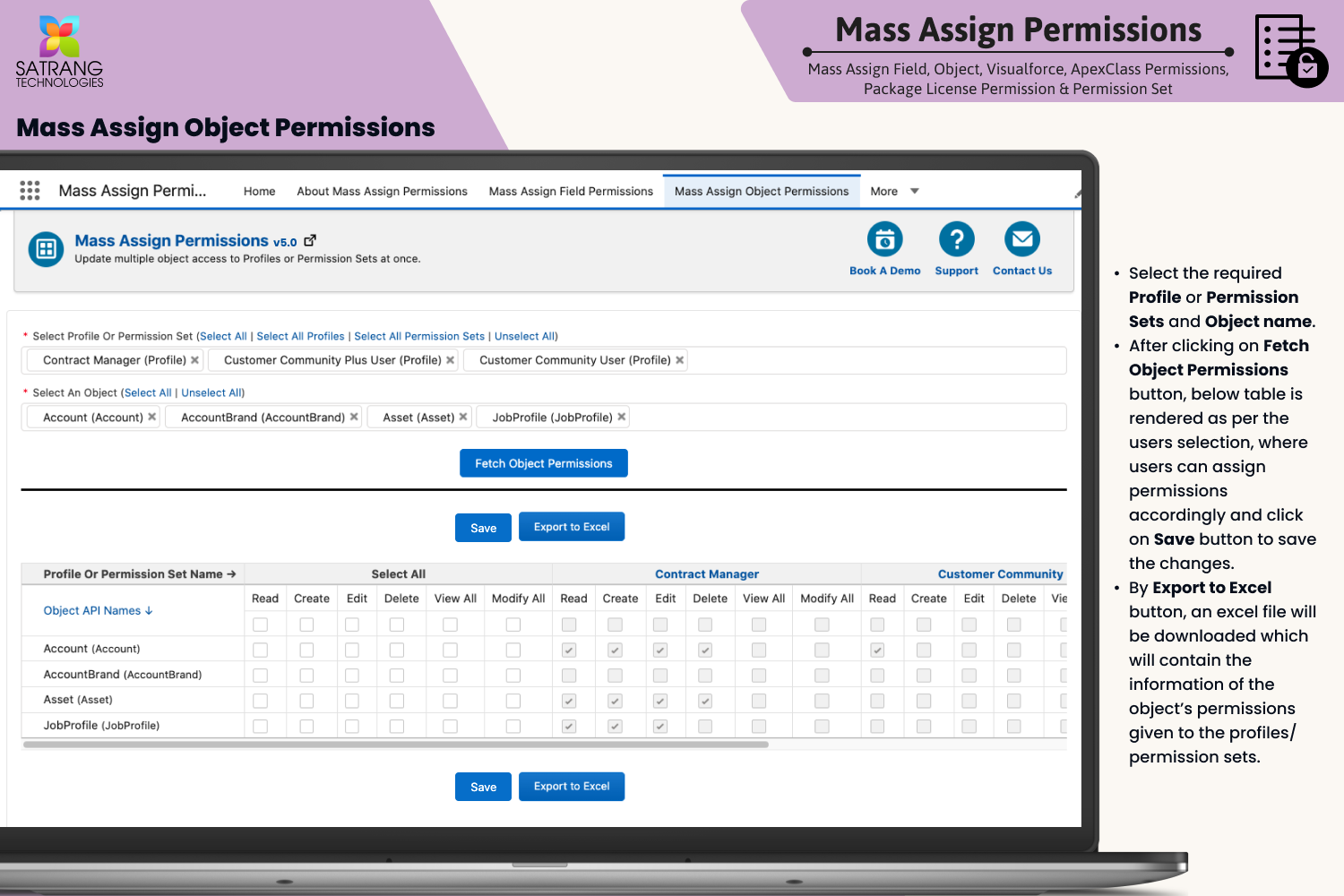 A. Introduction####This document lays out the terms and conditions by which ‘Satrang Technologies Private Limited’ (“Satrang Technologies”) agrees to provide you with our solution offering named - “Mass Assign Permission”. By registering for and using our application, you agree to the terms and conditions mentioned in this Agreement. If you are entering into this agreement on behalf of your organization or other entity, you represent that you have the authority to legally bind such entity to these terms and conditions, in which case the terms "you" or "your" shall refer to such entity. If you do not have such authority, or if you do not agree with these terms and conditions, you may not use the solution.####B. Ownership and Licensing ####Satrang Technologies Private Limited hereby grants you a non-exclusive, non-transferable, global right to use the solution, only for your own internal Organization's use. All rights not expressly granted to you are reserved by Satrang Technologies Private Limited.####You shall not (i) license, sublicense, sell, resell, transfer, assign, distribute, or otherwise commercially exploit or make available to any third party the product in any way (ii) change or make custom works based upon the solution; (iii) create internet links to the solution (iv) reverse engineer or access the solution to build a competitive solution (v) use it to send spam or computer viruses (vi) violate applicable laws and regulations.####Satrang Technologies alone shall own all rights, titles, and interests, including all related Intellectual Property Rights, in and to the use of its technology and any suggestions, ideas, enhancement requests, feedback, or other information provided by you or any other party relating to the solution. This agreement is not a sale and does not convey to you any rights of ownership to the Intellectual Property rights owned by Satrang Technologies. ####C. Liability Disclaimer ####The solution is provided to you on an "as is" basis. Satrang Technologies makes no claim or guarantee as to the reliability, timeliness, quality, suitability, truth, accessibility, correctness, or wholeness of the solution. Satrang Technologies does not claim or warrant that (i) the use of the solution will be secure, without disruption, without errors, or work in combination with any other hardware or software (ii) the solution will meet your needs (iii) errors or defects will be corrected (iv) the solution is free of viruses or other damaging components. ####Satrang Technologies shall not be held accountable for the damage or failure resulting from the use of the Mass Assign Permissions. ####D. Contact Information####For questions and more information contact us:####Satrang Technologies Private Limited ##1403-1404, Accord Classic##Goregaon East, Mumbai - 400063##India##+91-9820436966####Last Updated: Fri, 27th February 2026