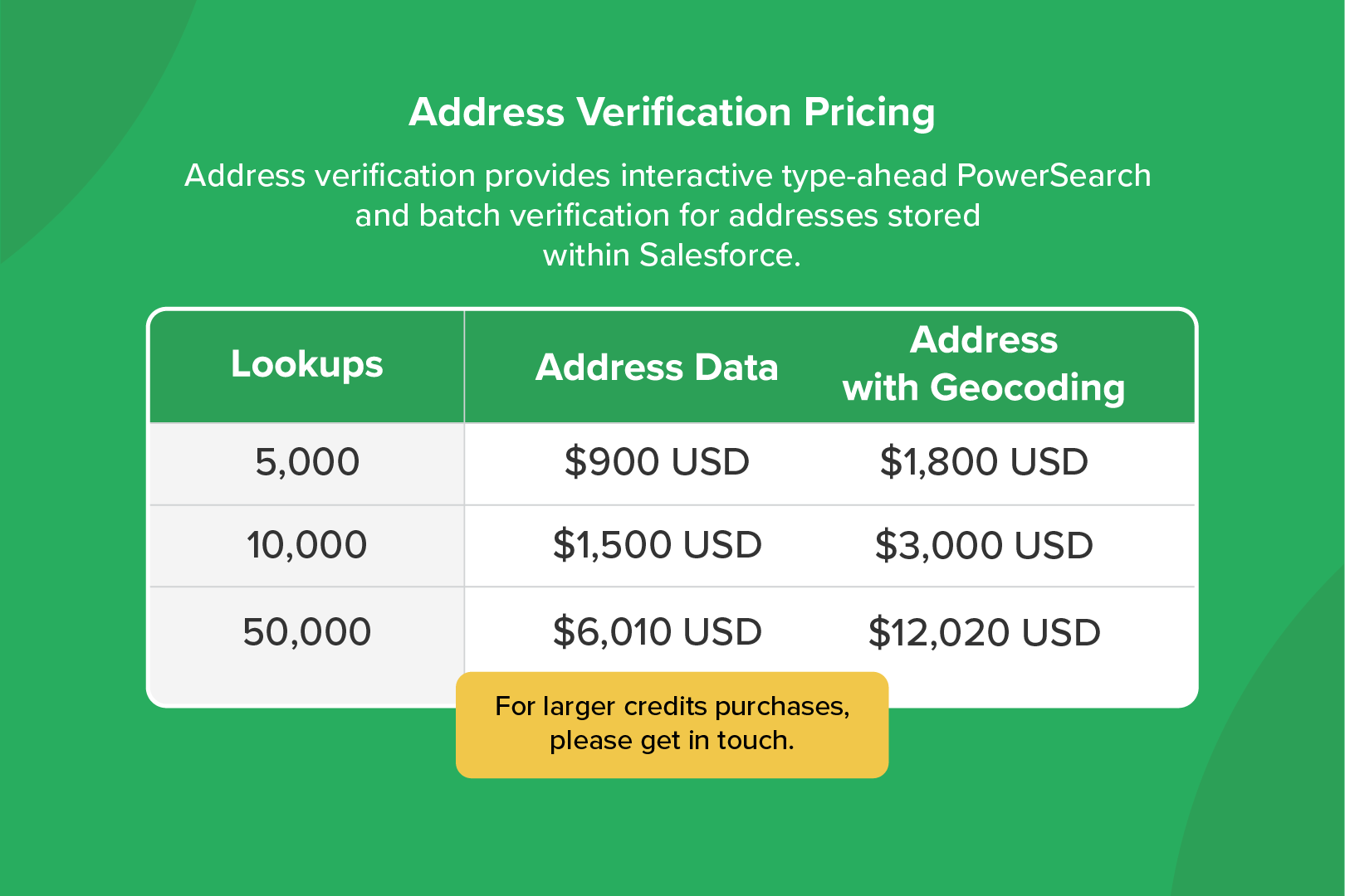 Starting at $2,200 USD per Org per year Use the "Get it now" button to install an obligation-free 15-day trial! Our pricing starts at $2,200 USD per org* per year. (*based on an org with 50 or fewer users.) We offer not-for-profit discounts on AddressTools licenses.