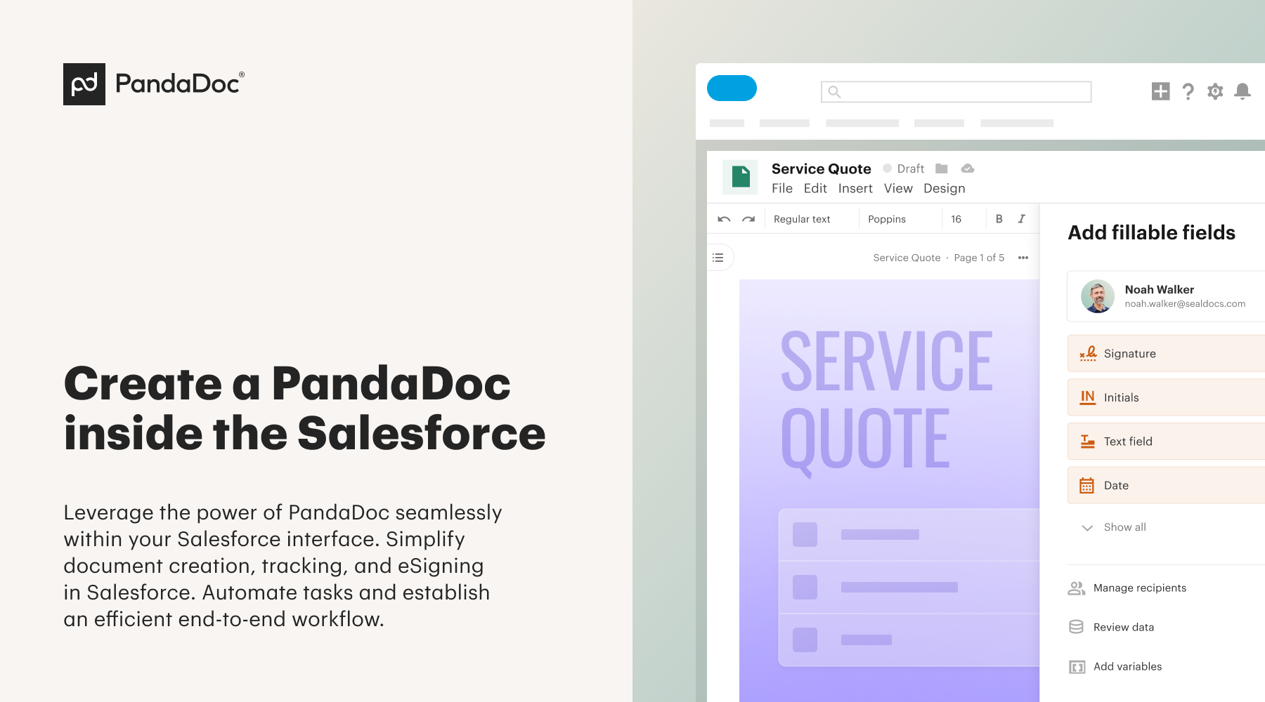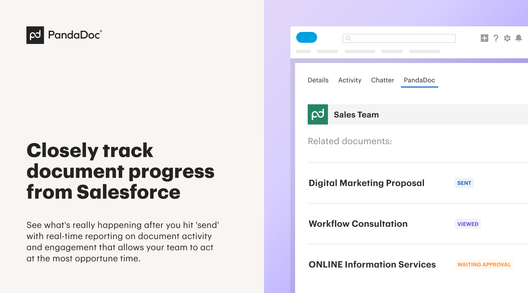 Professional ServicesBoost Salesforce’s ROI by integrating PandaDoc's features for document creation, e-signatures, and an end-to-end CPQ functionality. Provide your prospects with fast, error-free quotes in minutes — all from within Salesforce.