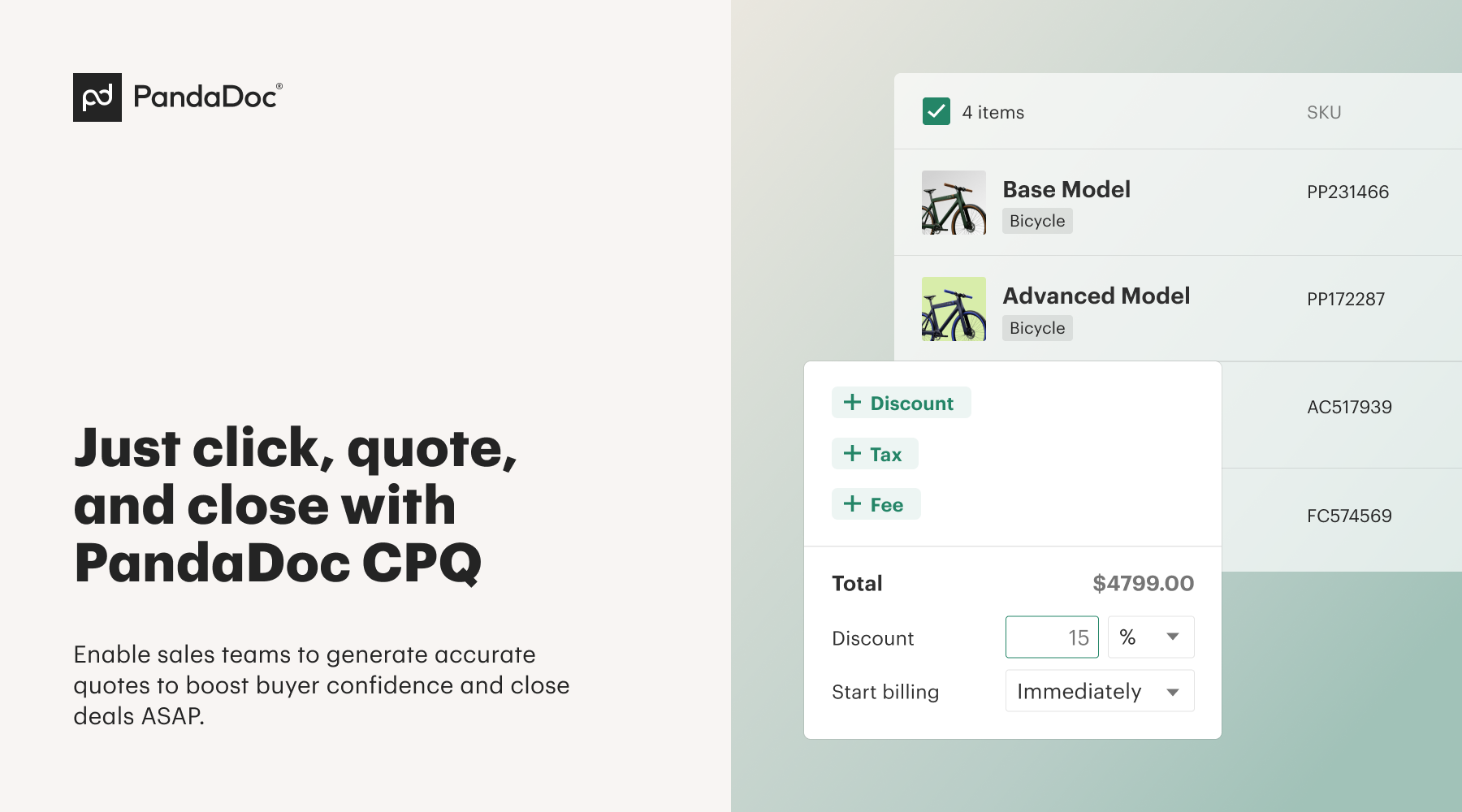 Starting at $49 USD per user per month PandaDoc for Salesforce includes document automation, eSignature, and native Salesforce integration. CPQ functionality available as premium add-on for Enterprise customers. Document Platform: $49/user/month Document + CPQ: Contact for pricing